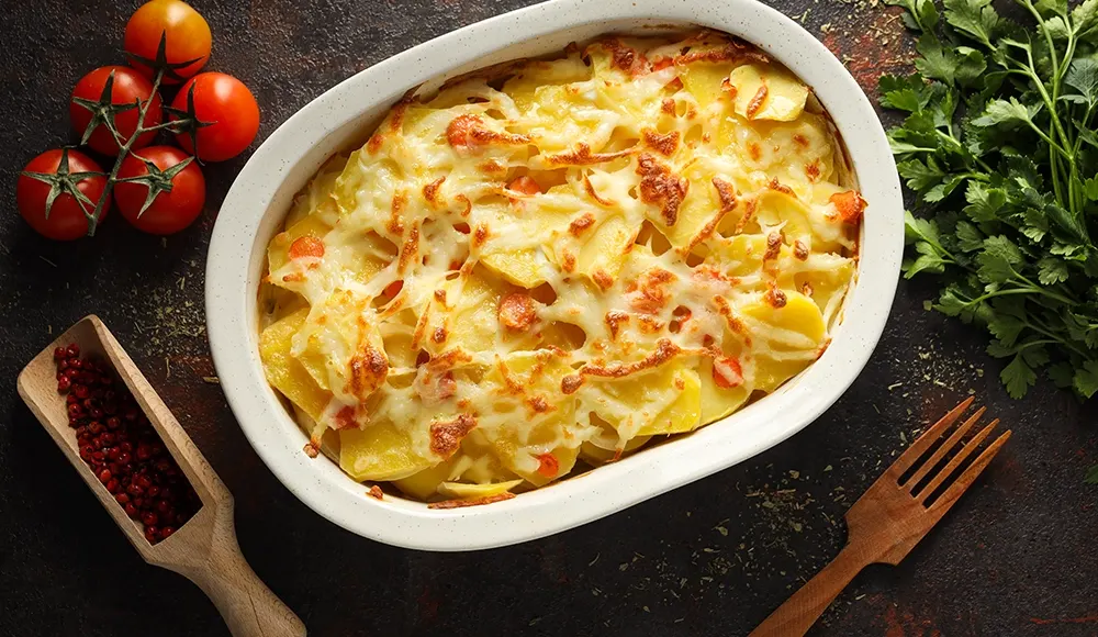 6. Kalan kaşar peynirini üzerine serpip önceden ısıtılmış 200°C fırında üzeri kızarana kadar pişirin.